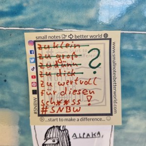 #smallnotesbetterworld #snbw #starttomakeadifference #haftnotiz #stickynote #Community #coaching #personaldevelopment #persönlichkeitsentwicklung #zitat #zitatdestages #zitateundsprüche #lieblingszitat #art #urbanart #streetphotography #street #photography #streetart #straßenpoesie #vonmenschzumensch #blablabla #gedanken #wertvoll #klein #gross #dick #dünn #höraufdeinherz