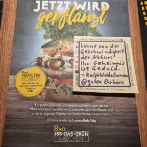 PS: Die Haftnotiz habe ich bei Peter pane platziert! Dort wird für jeden veganen oder vegetarischen Burger, welcher im März/April Verzehr wird ein Baum gepflanzt. Ich konnte so meinen mehrheitlich Verzicht auf Fleisch direkt noch mit einer guten Tat verbinden!