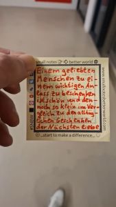In diesem Sinne… Start to make a difference… Und kleb Deinen Mitmenschen mal wieder eine… Positive Haftnotiz 😉